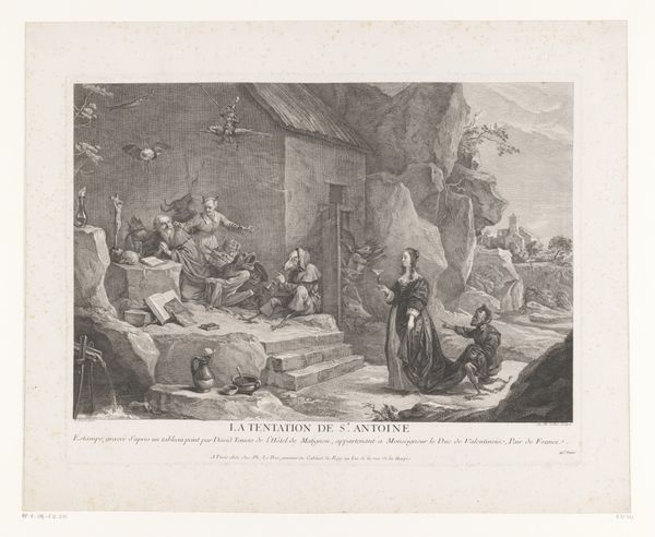 Editor: Here we have Wilhelm Hecht’s "Stadsgezicht met de heilige familie en schenkers," an engraving, likely completed sometime between 1871 and 1907. The density of figures against that intricately detailed cityscape feels both crowded and carefully arranged. How do you see the composition working here? Curator: The engraving technique allows for incredibly fine lines and tonal variations, doesn’t it? Notice how the artist uses this to create depth, leading the eye from the foreground figures to the buildings behind, and ultimately to that distant, almost dreamlike landscape. It’s a sophisticated interplay of textures, with rough-hewn architectural facades and the intricate folds of drapery. Editor: It almost feels like two separate scenes layered on top of one another, a holy scene and a city view. What are your thoughts about the lack of blending of these two narratives? Curator: Precisely! That lack of blending creates a deliberate tension, a visual puzzle. The juxtaposition forces us to consider the relationship between the sacred and the secular, between the ideal and the real. Is one elevated above the other or is their relationship complementary? I wonder about the structure that contains that lack of transition. Does the artist consider it a successful solution? Editor: So you’re saying the success of the artwork really hinges on that specific tension between the realms, achieved through that careful arrangement of light, line, and space. Curator: Yes. And it's interesting to analyze what this dissonance might achieve. Think about what kind of conversation emerges because of the disjunction. Editor: It's been fascinating to consider how such formal qualities shape the very meaning of the work. Curator: Indeed, reflecting on these formal elements reveals complex artistic intentionality.