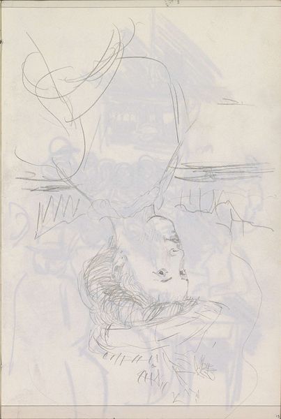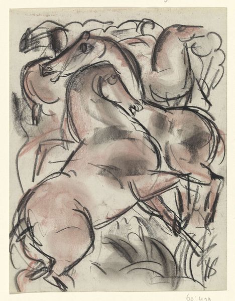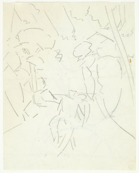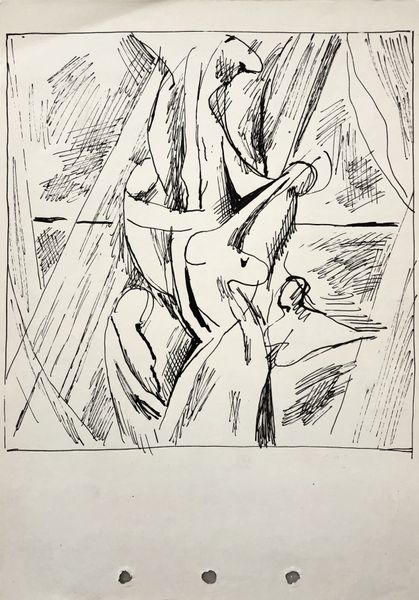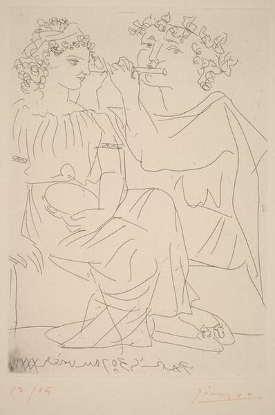 Curator: Immediately, the linework and stark contrast strike me—it's almost violent, raw. Editor: We are looking at "Polyphème", an etching and ink drawing created by Henri Matisse in 1934. It exemplifies the artist's modern style and his ventures into figuration and the nude. Curator: The title suggests a subject rooted in mythology; the one-eyed giant Polyphemus. Looking closer, one discerns the stylized, somewhat abstracted figure, his single eye almost dripping into his monstrous face. It's a disturbing image, unsettling, especially with such a fine and precise line. Editor: Notice how the choice of etching allows for multiple reproductions; This pushes against the preciousness of a unique art object. These prints were more accessible, allowing Matisse’s vision to reach a wider audience, thus affecting the marketplace and broadening the consumption of art. Curator: Precisely! What appears as spontaneity is controlled execution and thoughtful composition. Consider the contrast—areas are filled with gradations of tone, others with delicate linework that delineates the figures. It plays with positive and negative space in a very calculated way. Editor: Let’s not ignore the obvious phallic symbolism represented in this scene. Is Matisse using myth to explore modern desires or simply creating a modern image using available mediums of expression and art history for references? Curator: That contrast between ancient myth and modern process brings a compelling tension to this piece. Seeing the process, the means by which this image was transferred to paper—really allows us to connect with the artist's hand, his labor, and choices at a given moment in the history of artistic practice and production. Editor: This is a potent study in structure and material, showcasing Matisse’s unique balance between primal expression and meticulous execution. The raw aesthetic lends this work incredible power. Curator: Absolutely. The impact and accessibility that printing offered Matisse opens dialogues about how art impacts culture.