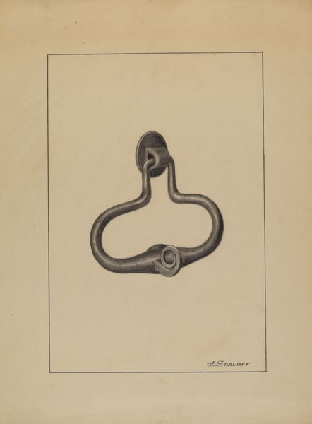 This is a drawing of a flatiron holder, made by Benjamin Resnick. While the medium is graphite on paper, let's consider what it depicts: an object made of iron. Ironwork has a long history, of course, but by the time of this drawing, it was entering a new era. The industrial revolution had made iron more accessible, cheaper, and able to be formed in new ways. But this drawing shows an iron made by hand, with clear marks of the hammer and forge. Its form is determined by the nature of hot metal, bent and shaped with great skill. The flatiron itself speaks to domestic labor. By extension, so does this holder, which would have kept a hot iron from scorching a tabletop. The drawing reminds us that even the most humble objects have a history, tied to wider social issues of labor, politics, and consumption. It is an image of an everyday item, elevated by being carefully observed and recorded on paper.