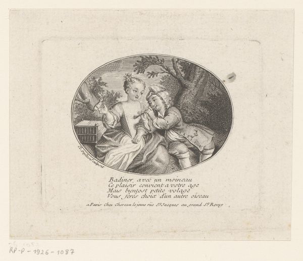 This print, "Zicht", made by an anonymous artist, presents a tableau framed by geometric patterns that contrast with the organic forms within. The composition, rendered in monochrome, invites us to consider how line and form articulate meaning. The central oval contains two figures in a landscape, their forms softly modeled and entwined in a narrative suggestion. This contrasts with the grid-like border, which imposes a structure around the fluid scene, highlighting the interplay between nature and order. Semiotically, the oval can be read as a lens, focusing our gaze and framing our perception of beauty. The title "LA VEUE" and the inscription below can be seen as visual and textual signs, creating a dialogue that deepens our understanding of the work. The formal interplay between the geometric border and the organic scene challenges traditional notions of representation. As a viewer, engage with how these signs interact, questioning the boundaries of sight and understanding in this carefully constructed visual field.
