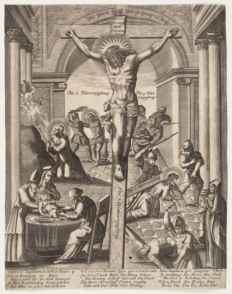 Curator: As we stand before this engraving, take a moment to absorb the scene—"Kruisiging van Christus" by Pieter van der Borcht I. It likely dates between 1573 and 1614. The Rijksmuseum holds this particular impression, made using engraving techniques of the Northern Renaissance. What catches your eye first? Editor: It's intensely detailed, almost overwhelming. The stark contrast between light and shadow emphasizes the suffering, but there's also a strangely formal quality to it. The sheer density of figures and symbols gives the work a heavy feeling...almost leaden with grief. Curator: Van der Borcht skillfully employs a landscape setting, which, unusually, becomes the stage for this central figuration. Do the traditional elements speak to you, in relation to that staging? Editor: Absolutely, everything means something! Notice the sun looking down from above, and the accompanying text on the tablet. Then there's all that is spread on the ground...bones and other grim remains! Van der Borcht utilizes recognizable iconography that immediately roots this historical painting within a deeply Christian cultural context, while alluding to even earlier mythologies concerning death, sacrifice, and rebirth. Curator: Precisely. This engraving also shows influences of earlier artists, doesn't it? Editor: Without a doubt! You see the influence of other styles through a classical approach in its construction. Van der Borcht is definitely pulling from well-established visual traditions while wrestling with new printing techniques, but does he achieve the same emotion with this particular pen drawing style? Curator: I think it works; there is tension in all this busy-ness! You can observe the gestures; the story it carries is all so human in its emotive nature. Editor: I see what you mean— it allows a space for contemplation amid all that visual noise. There's a powerful sense of historical witnessing invoked in this engraving, achieved by packing in all this imagery.
