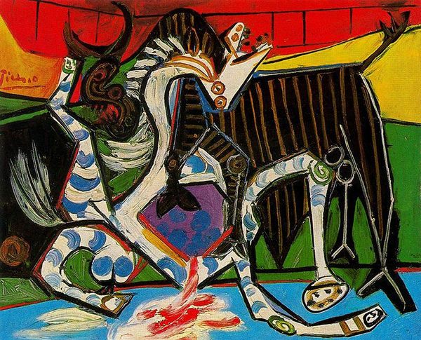 Pablo Picasso made this bullfight painting with oil, I guess sometime in the mid-twentieth century. Look at the way he's put down the colour, not trying to be realistic, but working it out as he goes, in the doing of it. You can tell he didn't want to make it too slick. The thick, opaque paint feels almost crusty, especially in the dark reds and browns of the bull, and the cool greys of the horse. It’s like he’s building up the surface, letting each stroke add to the drama. See that little squiggly line of purple on the bull's back? It’s like a tiny, strange signature of movement and pain, a splash of colour that brings the whole chaotic scene alive. It reminds me a little of Goya, not the exact style, but in the raw emotion, you know? Ultimately, art is like a big conversation across time, where everyone's shouting their own bit, and Picasso certainly knew how to make his voice heard. He lets it all hang loose, doesn't try to tie it up too neatly.