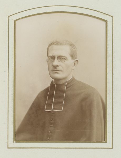Johannes Wilhelmus Franciscus Offenberg captured this portrait of a clergyman using photography, a medium that was still relatively new at the time. The composition immediately draws your eye to the face, framed by an oval which is echoed by the soft curves of the clergyman's features and the gentle lighting that models his face. This creates a sense of calm and serenity, inviting contemplation. The sepia tone flattens the image, emphasizing form and texture over vibrant color. The use of a subdued palette invites closer inspection of tonal variations, from the light reflecting off his forehead to the deep shadows of his cassock. What's particularly intriguing is how Offenberg uses the formal constraints of early portrait photography—the stillness, the posed nature—to suggest inner depth. The portrait challenges conventional notions of religious authority, inviting a more nuanced reading of the sitter's character.