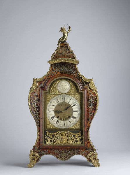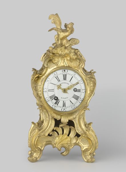 Editor: Here we have a Musical Mantel Clock created between 1765 and 1775 by Jean Baptiste Martre. It's a striking assemblage of metal, really ornate. I’m initially struck by how extravagant it seems. What social statements do you see embedded in this clock, and its creation during that period? Curator: Well, clocks themselves were statements of wealth and precision in the 18th century. But a musical clock? That elevates it to a potent symbol of aristocratic luxury. This wasn't just about telling time; it was about demonstrating the owner's refined taste and financial power. Think about the socio-economic climate of the time. What does creating such an object signal? Editor: It feels almost… defiant? Knowing that a musical clock required a ton of time, money, and skill, during times of potential upheaval. Curator: Exactly! Its elaborate decoration, reflective of Rococo style with all that asymmetrical design, was a direct assertion of the patron’s status. These types of items are very closely linked to the patron that commissioned the artwork. Do you think it was only to their taste? Editor: Probably also projecting the patron's image of themselves for other elites, or whoever came to their place? Curator: Precisely. It speaks volumes about the performative aspect of wealth during the period. A lot of Rococo art serves to mask reality, which is very clever. What I find truly interesting is the way such objects were displayed. Do you have any insight to share on this? Editor: This wasn’t tucked away. This would be the center of attention. The sound, visual, the metal and sculpture. Thank you for clarifying, this helped solidify it! Curator: Glad I could add to the context!