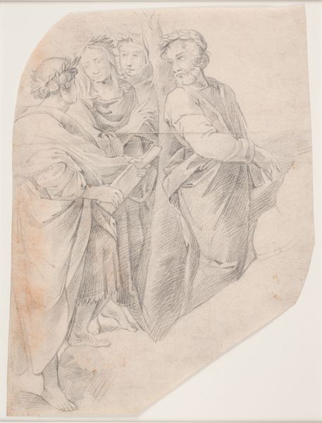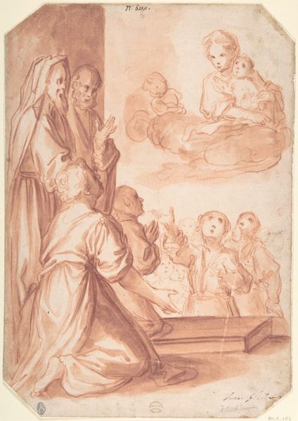 Curator: This is a study by Hendrik Krock, created sometime between 1671 and 1738. It is titled "Studie efter Guido Renis freske i Cappella dell' Annunciazione, Palazzo Quirinale, Rom. (Marias fødsel, venstre side)," which translates to "Study after Guido Reni's fresco in the Chapel of the Annunciation, Quirinal Palace, Rome. (The Birth of Mary, left side)". Editor: It strikes me immediately as a composition in gestures. A wash of umber and sienna tones depicts figures arranged in a careful choreography of attentiveness and care. The material, charcoal on paper, lends itself well to capturing these fleeting movements. Curator: Krock made this drawing as a study of the fresco "The Birth of Mary" by Guido Reni, which resides in the Quirinal Palace in Rome. The scene, of course, depicts the moments surrounding the birth of Mary, mother of Jesus. The figures represent the women who assisted in the birthing process, a traditionally female sphere, giving support, care and attendance to a miraculous moment. Editor: Absolutely, and note how Krock focuses on the dynamism created by the converging gazes and gestures. The light and shadow define forms but also guide our eyes across the composition. See how the tonal variations highlight specific areas and create a rhythmic reading of the figures’ interactions. Curator: Thinking about the figures within a historical context, we should consider the traditional roles ascribed to women, particularly concerning childbirth and domesticity. Krock's choice to replicate this specific segment of Reni's fresco arguably illuminates how women and female community have historically been integral to both everyday life and pivotal cultural and religious narratives. Editor: Yes, the lines vary between sharp definition and suggestive softness, giving each figure both solidity and a transient quality. This balance really enhances the sense of momentary action. Curator: I agree. Overall, what strikes me is how Krock engages with themes of community and femininity, drawing from the historical context of the depicted scene to inform our reading of a pivotal point of faith through a very human experience. Editor: And from my point of view, focusing on pure form, the harmonic placement of these figures demonstrates that visual storytelling can effectively distill profound human and spiritual connections.