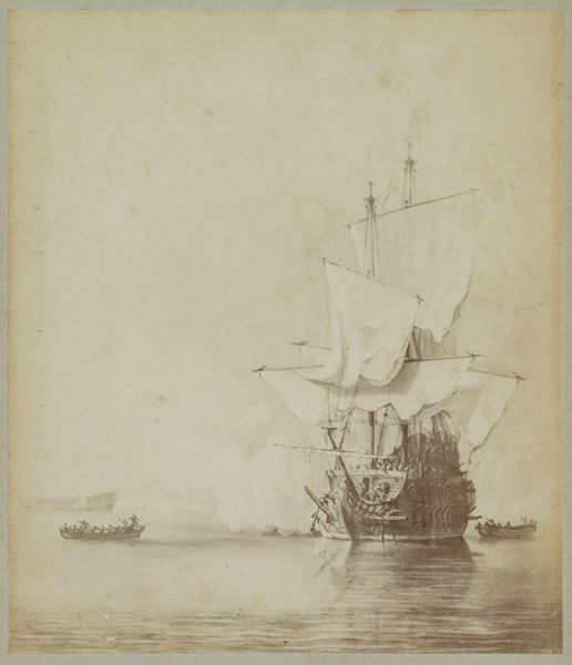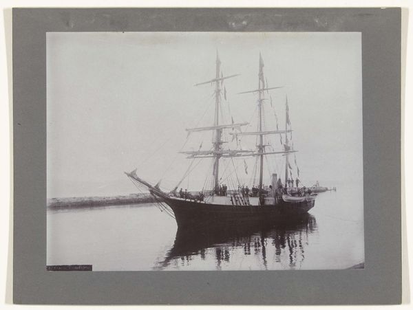 Editor: This photograph, "Schip op een water, vermoedelijk bij het Suezkanaal," was taken by C. & G. Zangaki, sometime between 1880 and 1900. It shows a ship at sea, likely in the Suez Canal. It’s quite striking how the photographer captured the ship amidst such a still body of water. What stands out to you? Curator: The formal elements are indeed captivating. The composition emphasizes a verticality through the ship's masts that intersect the horizontal plane of the water, dividing the photograph into distinct zones. Observe the contrast; the intricate details of the ship oppose the expansive, almost blank sky. Editor: That’s a good point; I hadn't noticed the visual tension as clearly. Could you expand on the significance of the structural divide between the water and the sky? Curator: Certainly. This deliberate division highlights the constructed nature of the image itself. The differing textures create a formal dialogue. The water's reflective quality versus the atmospheric perspective used for the sky establishes a visual depth. Do you perceive any geometric patterns that guide the eye? Editor: I see how the rigging creates a network of diagonal lines that converge, almost like a spiderweb. The small island adds another layer with its softer contours contrasting against the ship's geometry. Curator: Precisely. The interplay of line and form here speaks volumes about the photographer's awareness of spatial relationships and geometric balance. Consider how light manipulates form and void. The ethereal light enhances the mood, evoking themes of distance and human navigation within vastness. It creates an almost sublime effect through minimalist design. Editor: Looking at the photograph again, the delicate details of the ship contrasted with the expansive sea now evoke a sense of solitude and scale. Thank you; I see so much more in this piece now than when I started. Curator: A successful engagement with any artwork alters our initial view. Close viewing allows you to appreciate subtleties you might have originally overlooked. This photo becomes less about a ship in water, and more about structure, form, light, and texture.