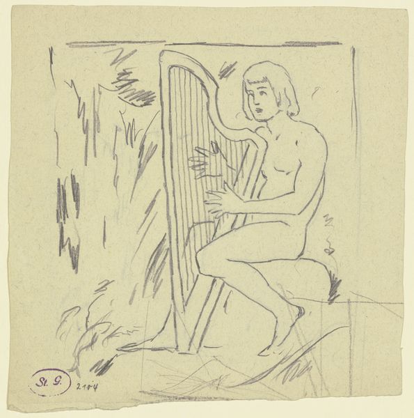 This is Edvard Munch's "Untitled 21", a drawing rendered with crayon and pencil. The raw, unfinished quality of the sketch immediately grabs attention with its bold lines and minimal use of color, primarily orange and green. Notice how the figures, a man and a woman, are framed by vertical lines that could be trees, creating a sense of enclosure or emotional confinement. Munch destabilizes traditional notions of beauty by prioritizing emotional expression over realistic depiction. The sketch uses a semiotic system in which lines and colors act as signs. The harsh lines may signify anxiety, and the use of color, or lack thereof, could highlight the emotional starkness of the scene. This piece functions as a cultural artifact, reflecting the shift towards psychological exploration. "Untitled 21" invites us to continually reinterpret the boundaries of representation.