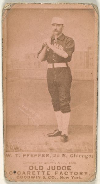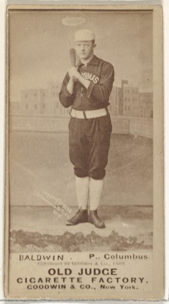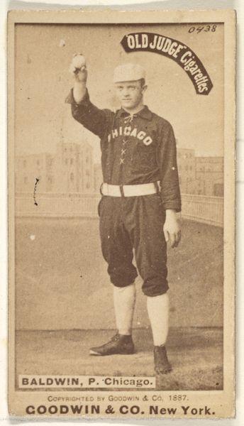Editor: Here we have a piece called "Baldwin, Pitcher, Chicago, from the Old Judge series (N172) for Old Judge Cigarettes" made in 1887 by Goodwin & Company. It seems to be a printed portrait of a baseball player on aged paper. I'm curious, what does this image evoke for you? Curator: This portrait, embedded within a cigarette card, speaks volumes about the intertwining of celebrity, commerce, and cultural values. Consider the baseball player himself as a modern-day hero. He is rendered as a contemporary icon of American prowess. The brand name hovering above him isn’t just advertising cigarettes, it's imbuing the figure with an aura of judgment, linking success and admiration to a product. It's as though smoking these cigarettes might somehow bestow the same characteristics of this famous player on you. Do you think the advertisement adds meaning to the artwork, or do you see it the other way around? Editor: That's interesting. I mostly focused on the baseball player. But you're right, the “Old Judge” suggests this authority. Curator: Precisely! The card format itself is also fascinating. Think about how these small, easily distributed images helped solidify Baldwin's fame but also reflect a broader democratization of art. Art, at the time, wasn’t locked away in a gallery for the upper class; now, art exists in the hands of the masses, connecting aspiration, consumption, and collective identity. How do we continue to see modern parallels to this phenomenon today? Editor: I hadn't considered the democratization aspect. It makes you think about how images of celebrities function in our social media landscape today. Thank you for this perspective! Curator: It's always insightful to see how past forms of cultural expression echo into our present, and, indeed, our futures.