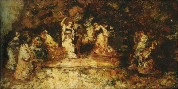 Editor: So, this is “Women in a Forest” by Adolphe Joseph Thomas Monticelli, painted sometime between 1870 and 1886. Looking at it, I get a really intense, almost chaotic vibe from the brushstrokes. It's like the forest itself is alive and swirling around these figures. What do you see in it? Curator: Well, you know, when I look at Monticelli, I don’t just see figures and trees. I see echoes. Echoes of colour, of light, but most importantly, echoes of the emotional tempest Monticelli must have been feeling. Do you see how the dabs of paint practically dance? Editor: Definitely! They’re not blended smoothly; you can really see each stroke. Curator: Exactly! And that's key. It’s almost like he's trying to capture fleeting impressions, the kind that only a heart brimming with feeling could perceive. It is a rejection of the established classicism with idealized form for something messier, and something truer to experience. Editor: It does feel very modern for its time. I guess that’s why he's been labeled as "abstract expressionism". Curator: Labels! Always boxing artists in. I would say that what's really fascinating is how Monticelli anticipates movements like abstract expressionism, while rooted in the romance of capturing the unseen. Did it occur to you that perhaps the swirling colours evoke music? Editor: Oh, that’s a cool interpretation! I hadn't thought about music at all, but it definitely makes sense with the rhythm of the brushstrokes. Curator: Right? Almost like he's composing a symphony of colours and emotions on the canvas. It also makes me wonder about the women…Are they real, imagined, or memories? We will never know. Editor: This piece is much more intriguing than I first thought. Now I see a deeper, almost hidden language in it. Curator: Isn't it wonderful when art does that? It whispers secrets and provokes endless reflection.