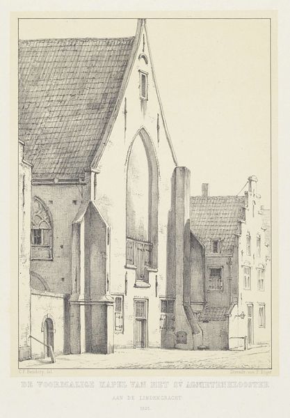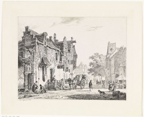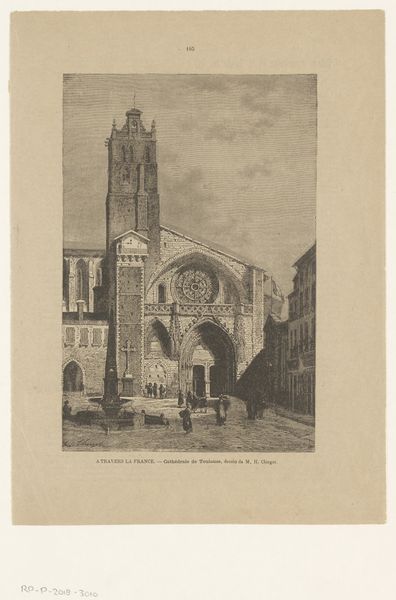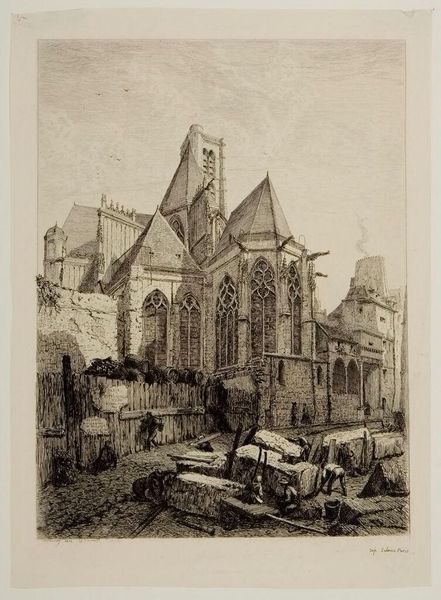 Curator: This is "The Church of S. Vivien in Rouen," an etching by Alfred Louis Brunet-Debaines. Editor: It’s a rather somber scene, isn't it? The tight, gray lines evoke a feeling of old age and quiet contemplation. Curator: Absolutely. Brunet-Debaines, active in the late 19th century, was known for his meticulous attention to architectural detail using the etching process. Notice how the textures of the stone and timber are rendered. It speaks to a particular moment of urban expansion and the preservation of sacred spaces. Editor: The church itself acts as a powerful emblem here, its towering presence amidst the ordinary street hinting at enduring faith. Note also the figures in the foreground—their postures seem to echo a silent reverence for the place. Curator: I agree. The printmaking process allowed for the mass production of such images, enabling a wider audience to contemplate both architectural progress and religious themes. Editor: It leaves me with a sense of history deeply embedded within the everyday. Curator: Indeed, a layered testament to a specific time and place.