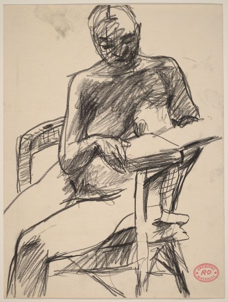 Curator: Here we have Hanns Ludwig Katz’s ‘Halbfigurenbildnis einer Frau von vorne,’ which translates to “Half-length Portrait of a Woman from the Front.” The materials employed appear to be primarily charcoal and pencil on paper. Editor: My initial impression is one of melancholy. The muted tones and the subject’s weary gaze create a somber mood. The charcoal is thickly applied in certain areas, lending a palpable weight to the figure. Curator: Katz was a Jewish artist living and working in Germany during a tumultuous period. Though undated, this work likely reflects the growing unease and anxieties of the interwar years. Many artists, part of the larger Expressionist movement, used portraiture to confront the psychological state of the individual amid broad political uncertainty. Editor: Note how the rough strokes build form but remain fragmented. The face is rendered with deep shadows that carve into the cheekbones and eyes. The overall composition is frontal, focusing entirely on the woman’s internal state as revealed by Katz. It's this fragmentation combined with that central gaze that makes the artwork very expressive, almost jarring. Curator: Absolutely. The woman’s clothes seem loose, informal; one might imagine a worker perhaps, an everywoman marked by worry. The sketch-like quality suggests a raw honesty, foregoing traditional artistic refinement to show a harsher truth. Perhaps a commentary on the toll society extracts from ordinary people. Editor: And while there are few, observe the strategically-placed touches of white that illuminate sections like the nose and hands, focusing the eye, further accentuating the surrounding dark contours. There is a sophisticated play between light and shadow to emphasize those expressive, almost exaggerated features. Curator: A poignant portrayal reflective of its time. Katz gives us insight into not just the woman, but perhaps her socio-economic struggles and the anxieties pervasive throughout the region. Editor: It leaves one with lingering thoughts regarding human fragility, a vulnerability keenly expressed through form and tone.