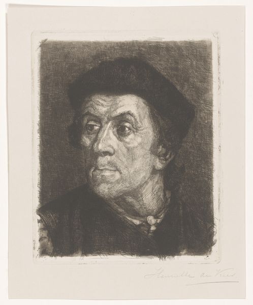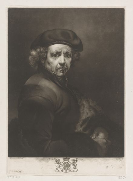 Editor: Here we have Giovanni Marco Pitteri's "A Man with a Beret and a Fur Collar," an engraving from the 1750s. It's struck me how…severe he appears. Almost challenging. What do you see in this portrait? Curator: Well, looking at the attire, it's indicative of wealth, clearly designed to project authority and status within a very rigid social hierarchy. The fur collar, the beret – they aren't simply about warmth. Think about the historical moment: this portrait was produced in Italy. Do you consider how the identity of marginalized people such as jews, people of color and the working class where affected by those in positions of power in this artwork? Editor: I hadn't considered it in that light. I was so focused on the individual. I mean, shouldn't portraiture reflect something unique about the subject? Curator: And what constitutes 'unique' when the entire visual language of the portrait is constructed to uphold existing power structures? Even the shadows and lighting contribute; notice how the face is partially obscured, creating a sense of mystery, of inaccessibility, which would not be offered to any average man. I urge you to consider which average man and woman were and weren't given an audience. Do we really "know" this person? Or is it a calculated performance? Editor: I guess I was seeing it as a representation of a person, not the representation *of* power, or rather the performance of power. It really changes how I see the artwork, thinking about it as more than just one man, but part of a larger structure. Thanks. Curator: Exactly. It is about acknowledging art as a dialogue with society. Always consider that art and its surrounding political forces affect people, either the figure or the potential spectator. Editor: That makes a lot of sense. I'll keep that in mind moving forward.