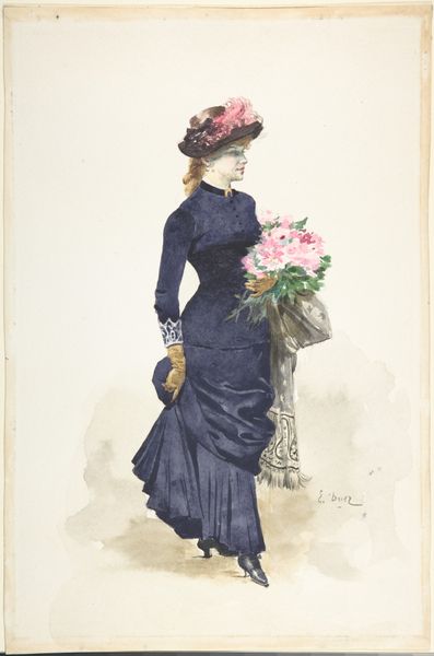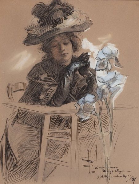 Editor: A first impression is of quiet elegance. The soft graphite strokes and restrained color palette create a mood of serene contemplation. Curator: Indeed. What we have here is Harrison Fisher’s 1903 pencil drawing, "A Lady of Leisure". Note how the artist utilizes subtle tonal variations to delineate form and texture. Observe, in particular, the deft handling of the sitter's costume. Editor: The cascade of the skirt seems almost abstract, a flurry of lines that somehow resolve into fabric. It suggests an understanding of textile production, how draping and tailoring give form. This also feels very intentional in contrasting labor with its apparent absence in her depicted life. Curator: An intriguing contrast! Fisher masterfully employs visual elements, notably line and form, to convey narrative. The strategic use of empty space draws attention to the subject, framing her within an unspoken social context. What is it that gives the image an incomplete feeling though? Editor: Is that incomplete feeling simply due to the sketch medium itself? I'd imagine he was working from a sitter; did that relationship come into play here through how the labor and the scene were presented, I wonder? It speaks to an understanding of fashion's role in signaling social class, how the act of adorning oneself becomes a statement of identity. Curator: Perhaps. Fisher creates a captivating study through his calculated design choices; it serves as a timeless exploration of class, gender, and societal roles rendered in pencil on paper. Editor: I am mostly just taken by how, despite what's conveyed through form, this piece remains alluringly unfinished; in some sense its materiality reflects how these dynamics are always at play in our reading of people in the world.