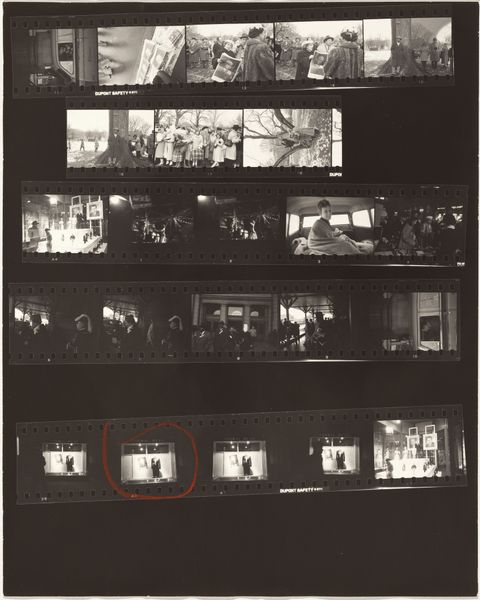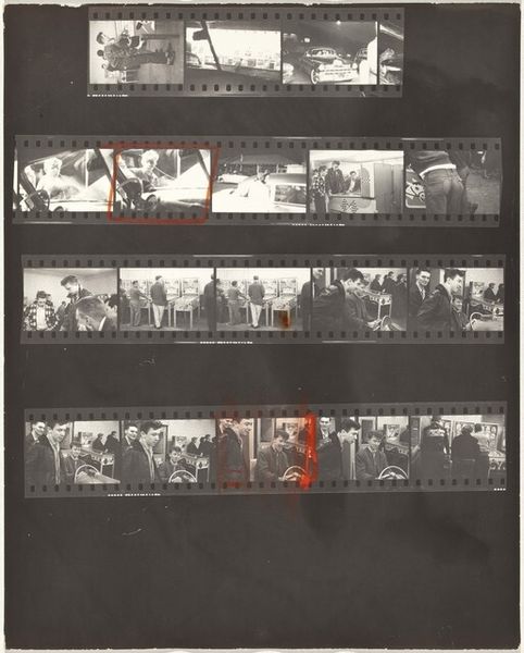 Curator: Here we have Robert Frank’s "Guggenheim 468/Americans 66--Hollywood," a gelatin silver print from 1956. The contact sheet showcases various scenes, seemingly candid moments, in Hollywood. Editor: It's gritty, raw. The immediate feeling is that of observation from the fringes—a kind of voyeuristic glimpse into celebrity and the spaces they occupy. The visual hierarchy implied by the marks on the sheet creates another layer to this idea. Curator: Precisely. Frank's work often challenged the idealized image of America. By showing a strip of film rather than isolated perfected shots, he disrupts the artifice that celebrity embodies. Think about how he captured those spontaneous street scenes, devoid of the usual Hollywood glamour. There’s a subversion of what it meant to be 'American' during the era. Editor: And look at the technical decisions: the high contrast and apparent blur contribute to that gritty feel. The actual film stock, its production and availability during that period, played a huge role in determining the picture’s aesthetic and reception too. Curator: It’s also interesting how Frank, a Swiss immigrant, brings an outsider's perspective to the quintessentially American topic of Hollywood. Consider the symbolic weight of figures like celebrities against the backdrop of social conformity during the 1950s. Are these selected scenes reinforcing or rebelling against existing visual culture? Editor: It really exposes the process of constructing imagery. We aren’t just seeing the finished product. We’re seeing the photographer’s eye at work, their own act of selection, the materiality of the photographic process itself—the film, the darkroom—and it democratizes the whole act of photography, stripping away any mystique. Curator: Absolutely, these images speak to broader anxieties about fame and American identity, viewed through the lens of cultural symbols and shifting social norms. Editor: And those technical choices become statements, turning a snapshot into a potent critique of that very fame. Seeing how the physical object reveals process helps demystify photography in itself. Curator: The cultural echoes reverberate even today. Editor: Indeed, its rawness maintains its radical feel even today.