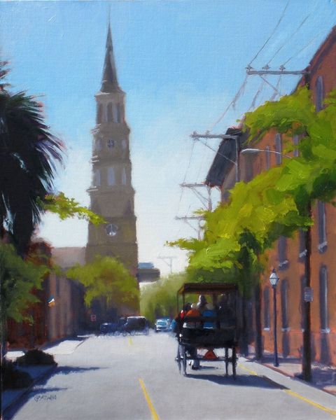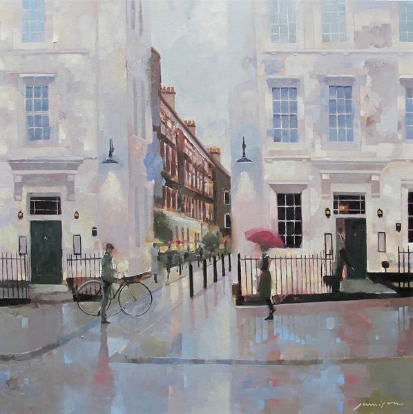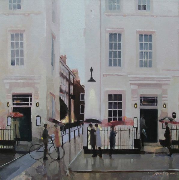 Curator: John Michael Carter's oil painting, "Theatre District London," offers an intimate look at a rain-swept cityscape, rendered in a distinctly Impressionistic style. Editor: It has such a muted, melancholic quality to it, doesn’t it? The soft greys and blues create a palpable sense of dampness and the solitary figures huddled under umbrellas add to that feeling of urban isolation, wouldn't you agree? Curator: Absolutely. And the viewpoint here is also really interesting. The artist places us within the flow of daily life, emphasizing the architecture as it’s interwoven with the lives of its inhabitants. Consider how the theatre district, often associated with spectacle and performance, is presented here as almost muted, ordinary, even. Editor: I think it's very telling how the artist doesn't glamorize the scene. Instead, the blurred figures and softened edges seem to speak to the fleeting nature of city life. It really underscores how even places known for their vibrant artistic presence are ultimately lived-in spaces experienced differently by each individual, a true slice of lived experience from those city streets. Curator: The artistic decisions, from the application of oil paint to the stylistic nods towards Impressionism and realism, point to a deliberate attempt to capture not just a visual likeness but also the atmosphere and mood of this specific place and moment in time. How do we understand the legacy of the London theatre scene as its history evolves? How is it represented in this painting? Editor: Right, and I can't help but also think about access, particularly, who gets to experience the theatre in places like London's theatre district, and at what cost? There’s a tension there between the artistic promise of theatre and the realities of urban existence and capitalistic structures in metropolitan areas. Curator: That's a fantastic point, offering new and crucial insight into its importance in our public consciousness and challenging assumptions about how urban art reflects social realities and institutional functions within our cultures. Editor: Thinking about how spaces and access are represented certainly changed how I view the entire piece, so thanks. Curator: Indeed, and from my viewpoint, I am glad for how well the art has adapted with socio-political norms over time and continue to question structures to give meaning in modern spaces.
