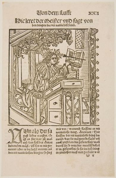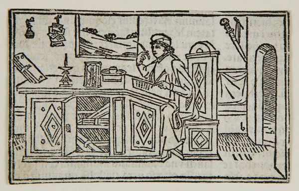Curator: This woodcut, "Initial P, Jacomo de Voragine in His Cell Writing," gives us a glimpse into the life of a medieval scholar. I’m struck by the detail in the rendering of his workspace. Editor: Yes, the stark black lines create a mood of intense focus. It feels very contained. Curator: Absolutely. The linear quality speaks to the process of block printing. One can imagine the labor involved in carving this image for mass reproduction. Editor: And that labor serves a specific purpose: to disseminate knowledge, to shape perceptions of figures like Voragine. It elevates his intellectual labor to a public good. Curator: Indeed. The very fact that this image was used by De Gregoriis highlights the commodification and distribution of such figures of thought. Editor: A small image, but it reveals so much about the production and circulation of ideas in its time. Curator: It certainly does, making us think about the social life of images, even today.