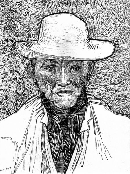 Curator: So here we have Van Gogh's "Peasant of the Camargue," an ink drawing from 1888, made while he was in Arles. Editor: There's an immediacy to it that grabs you, a raw vulnerability in the subject's gaze, and a strange kind of texture in the man's weary face. What exactly were the techniques Van Gogh used here? Curator: The magic's in the materials, or rather, the repetitive use of them. It's just ink on paper, but notice how he uses these dense, almost frantic little dashes and dots, what seem like frantic repetitive hand motions when looked at closely. It’s Pointillism applied with something closer to rage than serene observation, maybe. Editor: It is intense! Those stippled details evoke sun-baked earth and the wear of life under it, that specific sun, that land, that laborer. You feel his days have been relentless and hard and somehow filled with light. The weight and feel of paper comes across somehow, too. Do you think the quality of that paper stock made any difference to his choices? Curator: Perhaps more than we realize! The absorbent quality would definitely affect how the ink spread, influencing the density of the mark-making and perhaps leading to even more feverish strokes, creating the dynamism that the other portrait paintings might be less endowed with. But I see him thinking of millet, both Jean-François and a tiny grain, with the landscape implied here too, not simply suggested by the subject's life, do you agree? Editor: That's a connection I had never really considered, that this man IS his labor as his face. As he wears the land and the sun, he is the harvest and is bound up inextricably with materials and toiling. And also, look at the simple craft of making an image in ink – such an ordinary substance rendered profound by vision and persistent labour. Curator: Yes. It's a meditation on material existence itself. I look at that simple hat, those hard lines, that scarf. How everything tells us more about making itself than it shows a symbol. A bit of magic emerges when one starts really seeing that connection that informs it. Editor: It’s a powerful testament to Van Gogh’s radical commitment to everyday existence, not some kind of abstract ideal. I appreciate knowing and considering those aspects now. Curator: Exactly, thanks. It hits the senses beyond sentiment.