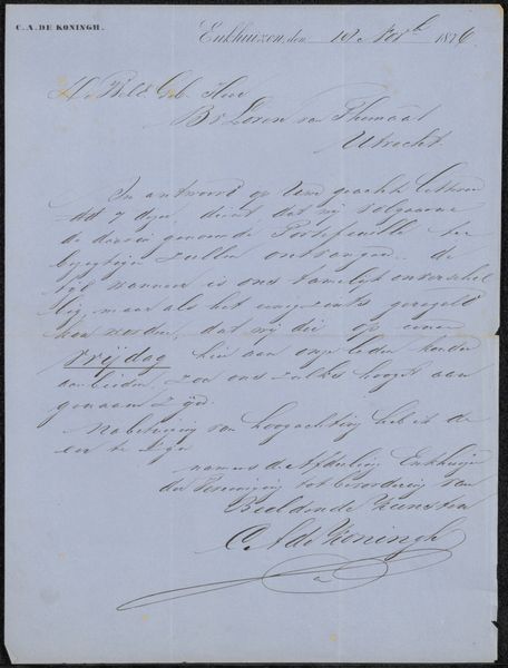 Editor: This is "Brief aan Philip Zilcken" by Joseph Mendes da Costa, created sometime between 1873 and 1939. It’s an ink drawing on paper. The aged paper and delicate penmanship give it such an intimate feel. What do you see in this piece? Curator: This letter presents an intriguing intersection of personal communication and artistic expression. Note the almost reverential quality imbued in the handwriting. The deliberate, flowing script—each character carefully formed—speaks to a deep sense of connection and respect between the sender and recipient. Do you see how the act of writing itself becomes almost ceremonial? Editor: It's like a carefully considered performance of intimacy. Almost like calligraphy, where each stroke means something more. Curator: Precisely. Consider how handwriting, especially in a pre-digital age, functioned as a unique visual marker of identity, carrying the sender’s presence and emotional state. The very choice to communicate through a handwritten letter conveys a sense of timelessness and considered reflection, as if imbuing a part of the author and culture. In an age defined by the instantaneous nature of the present day, isn't the intentional pace of a handwritten correspondence a symbol of endurance itself? Editor: Definitely, the artistry and personal quality would be lost in an email. I never considered the act of handwriting as part of the meaning, but that really shifts how I look at old letters. Curator: This artwork also hints at what it means to foster enduring human bonds in fleeting temporal spaces, suggesting how human emotion carries over into a material realm of symbolic significance. Editor: Thank you, this really opened my eyes to considering letter-writing as more than just sending a message. It holds so much meaning!