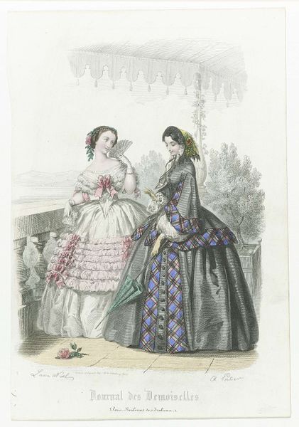 This is a print titled "De Gracieuse, Geïllustreerde Aglaja" made around 1869 by J. Bonnard. The print captures an era defined by transformation, and the aesthetic values of the rising bourgeoisie. The composition centers around three figures, their clothes rendered with meticulous detail. Observe how the artist juxtaposes the textures of fabric and the precise geometry of lace with the bodies beneath. Bonnard uses line and colour to create visual interest but also to highlight the cultural codes of fashion, class and gender of the time. The women’s elaborate dresses suggest the social status of the wearer. The muted colour palette and intricate detail evokes the mood of an industrializing society that sought to display affluence and refinement. The linear composition, texture, and the depiction of social roles challenge us to look beyond the surface, reflecting a desire to capture and codify a transient era. Meaning here is not fixed.
