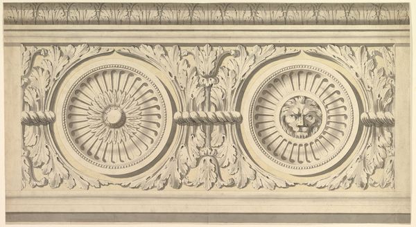 Curator: The drawing before us, likely created between 1850 and 1900, is attributed to Jules-Edmond-Charles Lachaise. This watercolor design offers a tantalizing glimpse of a trompe-l'oeil ceiling with a balustrade. Editor: My first impression is one of airy lightness. The colors are delicate, almost pastel, evoking a feeling of standing beneath a serene, open sky. It definitely pulls the eye upward. Curator: It's a very interesting reflection of the architectural aspirations in Europe at the time. Trompe-l'oeil, meaning "deceives the eye," allowed designers to create illusions of depth and grandeur in interior spaces, often for patrons seeking to display a certain status. The resurgence of neoclassicism also speaks to the importance of imperialistic aesthetics. Editor: The visual trickery is compelling; the painted balustrade lined with floral arrangements creates this delightful fiction of an opening above. And what could be seen through that opening is even more significant, an implied higher realm, suggesting not just wealth or class, but perhaps also spiritual aspiration. Curator: Absolutely, we can consider that through the lens of power and gender. Architectural flourishes of this kind were commonly implemented to reinforce dominant class structures but, importantly, we could consider these floral motifs as signifiers for wealth and cultivation; women, of course, historically carried the double burden of class expectations, especially visible domesticity. Editor: The centrality of the circular design contributes to the sense of implied importance too. Circular motifs carry rich symbolism cross-culturally representing totality and perfection and cycles of time. It underscores the permanence the client may have been striving for. Curator: Very astute! I'd agree. The very placement of this potential art piece, in a room's ceiling, can become symbolic as a social reminder of what and who one "looks up to" in 19th-century Europe. Editor: It's amazing how this single sketch can unravel so many interwoven layers of symbolism and meaning. A truly effective illusion. Curator: It reminds us that architectural spaces are anything but neutral, reflecting historical social dynamics and political intentions. Editor: And, indeed, that visual art holds incredible power to trigger emotions that affect those dynamics too.