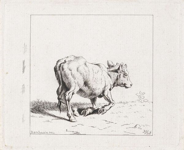 Pieter Janson etched this image of a reclining cow in the late 18th or early 19th century. Here, the cow lies calmly in the field, its posture evoking a sense of peace and bucolic contentment, while the clouds hang low in the sky above, mirroring the animal's restful state. This depiction of cattle connects us to a long line of pastoral imagery. Think of ancient Egyptian art, where cows embodied nourishment and motherhood, or even further, to Minoan Crete, where bulls were central to religious rituals. Across cultures, cattle symbolize fertility, abundance, and a deep connection to the land. But consider how the meaning shifts. In the 18th century, with the rise of agricultural societies, images of well-fed livestock became symbols of prosperity. This seemingly simple image taps into a collective memory, a yearning for a simpler, more agrarian past, evoking a sense of nostalgia for an idealized rural life. It is an enduring symbol, still resonant today, reminding us of our intrinsic connection to the natural world.