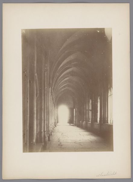 Editor: This is an untitled photograph from 1868, potentially by Georgina Cowper. It depicts a long, gothic-style corridor or cloister. It's so atmospheric, almost haunting. What do you see in this piece? Curator: This photograph presents a seemingly neutral architectural space, but within that neutrality lies a potent commentary on 19th-century power structures. What narrative emerges when we consider who has access to these spaces and who is excluded? What's reflected in this photographic gaze that's not immediately apparent? Editor: That's interesting. I hadn’t considered access. What do you mean by “photographic gaze”? Curator: The "photographic gaze" encapsulates the photographer's perspective but also implicates us, the viewers. The seemingly objective record of this architectural space can reflect Victorian England’s colonial gaze and notions of authority. Can you envision who may have commissioned such work? Were these spaces truly open to all? Editor: I suppose not. Given the timeframe, maybe it reflects a romanticized, nostalgic view of the past amidst rapid industrial change? Almost like a visual justification of established hierarchies? Curator: Exactly! The gothic revival style itself signals a deliberate harking back to a perceived ‘golden age,’ often obscuring the social realities of both the medieval period and Victorian England. Consider the composition— the linear perspective directs our vision. But towards what? A singular, distant point of light… or a vanishing point? Editor: That’s a good point; it’s leading, not inviting. It also raises issues about how history gets visually represented. Curator: Precisely! The past isn't passive. Photographs like this one were active participants in shaping narratives. Thank you, it’s a useful example when analyzing cultural representations, past and present. Editor: Yes, seeing it through that lens, it adds so much more nuance. Thanks!