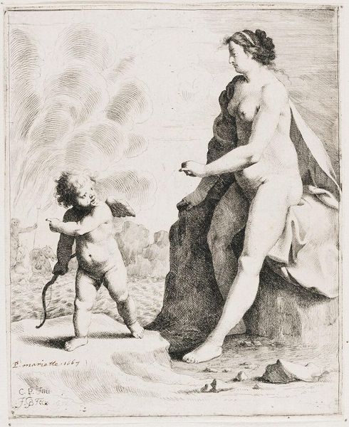 Editor: This is Gérard de Lairesse's "Expulsion from Paradise," an etching. It feels theatrical to me, almost staged. What can you tell me about how this image was received and understood in its time? Curator: Well, consider the power structures of the era. Etchings like these weren't just art; they were tools. Prints circulated ideas, morality, and religious doctrine widely. How does that knowledge change your interpretation? Editor: I see, it was a form of mass communication, influencing public perception! I hadn't thought about it that way. Curator: Exactly! And Lairesse's dramatic style likely amplified the church's narrative about sin and punishment to the masses. It's fascinating how art becomes a vehicle for societal control. Editor: That gives me a lot to think about. I'll definitely look at art differently from now on.