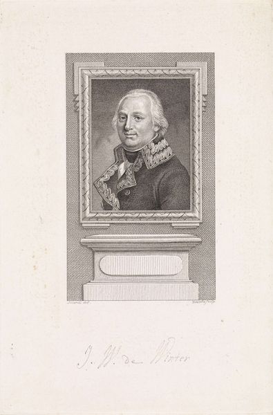 Editor: We're looking at a print titled *Portret van Karel Willem Ferdinand hertog van Brunswijk-Wolfenbüttel*, created between 1786 and 1809 by Reinier Vinkeles. It’s housed in the Rijksmuseum, and its subdued palette makes it seem almost dreamlike. It feels very formal and imposing; what strikes you about this piece? Curator: You know, it's interesting you say "dreamlike". Looking at it, I feel like I'm peering back through a dense fog of history. This engraving offers a really neat portal into the Neoclassical period. It’s a statement on power, carefully constructed. Notice the architectural frame—it mimics the classical structures being rediscovered and idealized at the time. Think of it as stagecraft, carefully crafting an image of leadership. Does the subject himself seem like he’s ‘performing’ to you? Editor: That’s a great point! He does seem quite self-aware, almost posing. I hadn't really considered the theatrical aspect before. So it's not just about documentation, but about crafting an image? Curator: Exactly! Vinkeles isn’t just making a copy. He’s participating in building the Duke's legacy. Consider the very clean lines, the idealised presentation of the figure – no warts and all here! What feeling do *you* get from his gaze? Direct, isn't it? Editor: Now that you mention it, it feels a little…unsettling. Direct, but almost cold. Curator: Precisely. He's meant to inspire awe and maybe just a touch of unease, solidifying his authority. Seeing the power of art and politics intertwined like this always leaves me floored. It really wasn’t about "warts and all"! Editor: I’ll never look at portraits the same way again! There is a silent narrative to be read when interpreting one. Curator: That's it! You’re already speaking fluent art! It really gets you thinking.