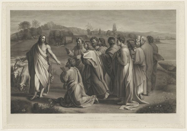 Curator: Look at the linear precision! The somber tones amplify the weight of the scene—absolute devastation. Editor: Indeed. This print, crafted by Francis Legat in 1792, depicts "King Lear Weeping Over the Body of Cordelia" from Shakespeare’s King Lear. It’s now held at the Metropolitan Museum of Art. Notice the fine hatching marks – it's drawing imitating engraving technique, quite telling, as Legat started out his career as an engraver, not an artist. The story, of course, is from Act 5, Scene 3 of King Lear. Curator: The composition pulls us right into Lear’s anguish, doesn't it? It’s interesting how the arrangement creates a stark contrast between the cold armor and drapery of the figures and the soft texture suggesting Cordelia’s lifeless form. Editor: And consider the economic implications of prints during this period! This image would have disseminated the tragic narrative of King Lear to a broader, perhaps less wealthy audience who couldn’t afford paintings. This accessibility is important—it democratized art consumption and ideas. And further note Legat was employed by Boydell Shakespeare Gallery, a printmaking business that aimed to benefit financially by publishing images inspired by Shakespeare. Curator: I’m struck by the details though. See how the sharp spear of the soldier punctuates the group dynamic – each element points us back to the tragedy in Lear's posture, which creates visual balance amidst turmoil. The material elements, how Legat created it... the ink itself is masterful. Editor: But beyond that, there is this commerce to consider and what these engravings did in promoting the art, as a manufactured commodity and cultural vehicle. Curator: You're right. Looking at the print through the lens of both the historical narrative and artistic execution, there’s a potent fusion of sorrow, artistry, and the human condition – all within a confined space. Editor: A perfect, compact drama made available by material means. It prompts reflection on tragedy, commercial viability, and accessibility, proving these aspects do indeed enrich our viewing experience.
