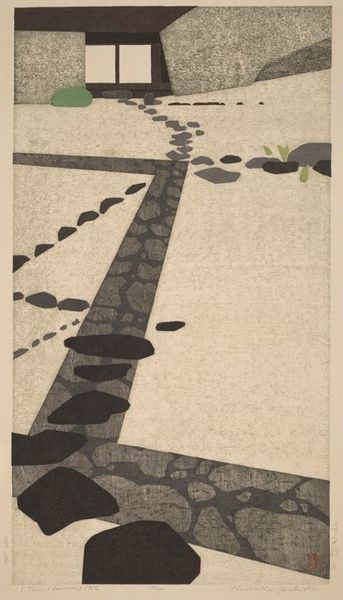 Editor: Jindrich Ruzicka's 1980 linocut titled "Strom (Tree)" presents a striking contrast between organic forms and geometric patterns. The bare branches create an almost haunting silhouette against a backdrop of lines and dots. What draws your eye when you look at this print? Curator: The immediate dichotomy, of course, speaks volumes. Ruzicka offers a tree, a deeply resonant symbol across cultures—representing life, growth, family, and even knowledge. Juxtaposed with those almost digital, binary patterns, it presents a tension between the natural world and the increasingly dominant, coded world humans construct. Do you see how even the solid blacks begin to break down, dissolving into abstraction at the lower edge? Editor: Yes, now that you mention it, the base almost becomes a collection of fractured shapes. Is it meant to represent a specific idea? Curator: Perhaps. Think about the period. 1980: the dawn of the digital age, the Cold War still casting its shadow. The fracturing of the tree's base might symbolize the fragmentation of traditional values or a questioning of our relationship with nature in an increasingly technological world. Or is it simply a play with form? The beauty of symbolic language is its open-endedness. Editor: So, it's not just a tree; it’s a conversation about our times captured in visual form? Curator: Precisely. The linocut technique, with its stark lines and contrasts, further enhances this sense of duality, a push and pull between clarity and ambiguity. It makes you wonder, what kind of memory or future is Ruzicka attempting to root? Editor: It definitely adds a lot of layers to what initially appeared to be a simple landscape print. Curator: Indeed. And isn't it fascinating how a seemingly straightforward image can hold so many coded ideas within? I never thought a tree could bear such powerful fruits.