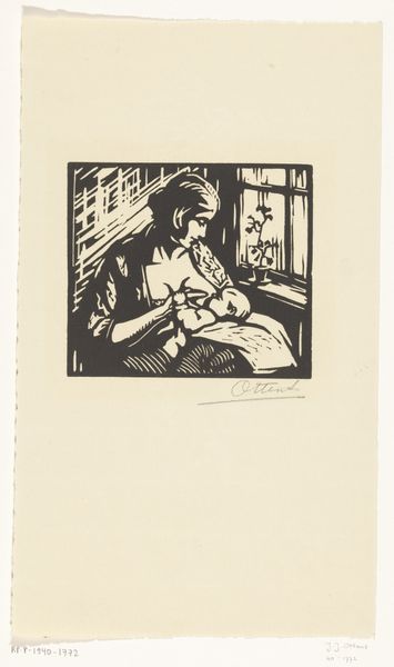 Salomon Garf probably made this black ink woodcut, Naaiende vrouw, on paper sometime in the early 20th century, and you can really see the carving process he used. The stark contrast creates such a strong, graphic image. It’s not trying to trick you with illusions; it lays bare its own making. Look at the way the light pours in from the window and creates these intense white verticals. It feels almost like a stage set. I love how Garf uses the black ink almost like a kind of emotional weather. It’s thick and pooling in the background, giving the whole scene a kind of claustrophobic feel, but then look at the delicate white lines that define the fabric in the woman’s hands. It feels like he's inviting us into this intimate moment, the simple act of mending, elevated to something profound. It reminds me a little of Paula Modersohn-Becker, in the way she captured the everyday lives of women with such intensity and feeling. Both artists show us that art isn't about grand gestures, but about finding the extraordinary in the ordinary.
