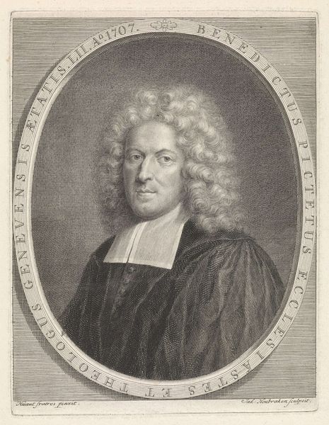 Curator: Here we have a rather striking baroque print, dating from between 1670 and 1713. It's titled "Portret van Johann Samuel Stryk" and currently resides at the Rijksmuseum. The artist who crafted this engraving is Pieter Schenk. What catches your eye first about this image? Editor: That wig, for sure. I mean, wow. It's practically a cloud. It kind of overshadows everything else. There is a kind of severe inscription in capital letters but somehow, I am still just fixated on the glorious curls. Curator: Ah, the wig! An unmistakable status symbol. Look above it, at the very top of the image; we see the phrase "IVSTE SANCTE SAPIENTER." It frames Stryk within an aura of justice, holiness, and wisdom – attributes befitting a prominent academic and advisor. Editor: Okay, yes, the lettering. Right above that fantastic head of hair. There's a gravitas implied, of course, it lends a heavy seriousness, and still... that's some dedication to follicular art. Even the heavy drapery and the man's rather steely gaze seem to melt a little under the weight of that cascade. It almost undercuts his importance somehow. Curator: That's an interesting point. Perhaps it reflects the tension of the time. Baroque art is all about the play between grandeur and humanity, a struggle between the earthly and the divine. Stryk, presented as both powerful and fallible, embodies this dynamic. Note also the very precise detail in the engraved lines which contrast strongly with areas that suggest deep shadows. Editor: I see it. It's a battle for dominance. Those sharp, deliberate lines are working hard to contain the fluff! It’s intriguing how printmaking allows for such controlled contrasts. Knowing this piece has survived centuries really brings a deeper resonance – we’re looking back not just at a face, but also a very particular moment in aesthetics and philosophy. Curator: Indeed, the print medium also allows for widespread distribution of his image, furthering his public recognition as a person of virtue. This helps cement his legacy in the visual culture of his time. Editor: Which makes one ponder: if portraits are attempts at immortality, did he imagine we would still be debating the merits of his hairstyle centuries later? Fascinating! Curator: Well, whether Stryk foresaw this conversation or not, the work ensures his enduring presence in the cultural tapestry. Thank you for offering that more visceral insight!