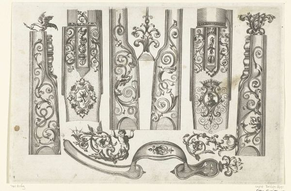 Editor: Here we have Theodor de Bry's "Buckles and Belt Decorations with Arabesques, Snails and Insects," from around 1588 or 1589. It's an engraving, and quite ornate! The level of detail in such a small space is really captivating. How might we understand the appeal of something like this to its original audience? Curator: That's a great question. Think about the context: the late 16th century, a time of growing merchant power and increasingly complex social codes. Ornamentation, particularly in personal accessories, broadcast status and taste. This wasn't simply decoration; it was a visual language of social aspiration. Editor: So, the design itself might be making a statement? Curator: Precisely! These weren't just functional buckles. De Bry's design incorporates elements like arabesques and natural motifs, all meticulously rendered. These details evoke classical learning, the appreciation of nature, and even burgeoning scientific interests—all status markers of an educated and sophisticated individual. What about the print form itself; how might that have impacted its function? Editor: Because it’s a print, that means these designs could be disseminated more widely, allowing for greater access and, perhaps, standardization of these fashionable motifs. Curator: Exactly! It brings up interesting questions of how art was consumed and how these designs were shaping, and were shaped by, cultural values. Consider who might have been commissioning and buying such works, and what role these accessories played in the theater of daily life. Editor: So, looking at it now, it is a piece of art, but at the time it was communicating more broadly to culture and society. This helps me think about how art can be interwoven with societal power structures. Curator: Indeed! These intricate designs, initially intended for a select group, now offer insights into the complex relationship between art, status, and social dynamics of the late Renaissance.