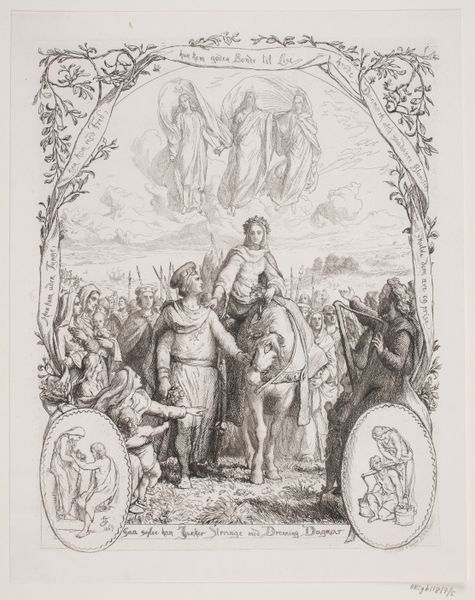Curator: This engraving from 1863 by Lorenz Frølich is an illustration for "The Lord's Prayer." What strikes you most immediately? Editor: Well, the stark contrast gets me first. All those delicate lines to depict...suffering, really. A whole economy of labor embedded in that rendering. Curator: It's intense, isn't it? Frølich captures a powerful dichotomy between divine serenity and human turmoil. The upper register is luminous with that prayer, then you see what looks like a descent into hell, literally. Editor: Absolutely. And considering this is a print, we should think about its wider dissemination. Reproducing images makes them available to different layers of society – but what specific material conditions informed Frølich’s choices in creating this piece? Was he consciously designing a work that would speak to different viewers or consumers? Curator: That’s such a valid point! And perhaps it speaks to our own dual nature. This image works its way into my heart through both agony and… acceptance. It acknowledges the totality of experience – not just the pretty parts. The composition itself mirrors this – a top-down structure where one extreme impacts the other, a material condition where our own humanity is printed into every etched line. Editor: You've touched upon materiality which resonates with how such religious imagery functions—like mass-produced rosaries and saint medallions, where repetition imbues the object with spiritual worth beyond its literal materials. Was it initially a commission? I would be curious to dig deeper into Frølich's work conditions, fees and reception and the effect all these factors may have had in its social life. Curator: These are definitely relevant avenues of study; in fact, knowing a bit of the economic exchange would shift its gravity in new directions. But beyond this, it touches on timeless fears— the unknown, death, injustice— things that haunt and ultimately make our world worth saving, line by agonizing line. Editor: It’s unsettling and deeply resonant all at once – even for this devoted materialist. It gives plenty to examine about the intersection of craft, faith, and social conscience.