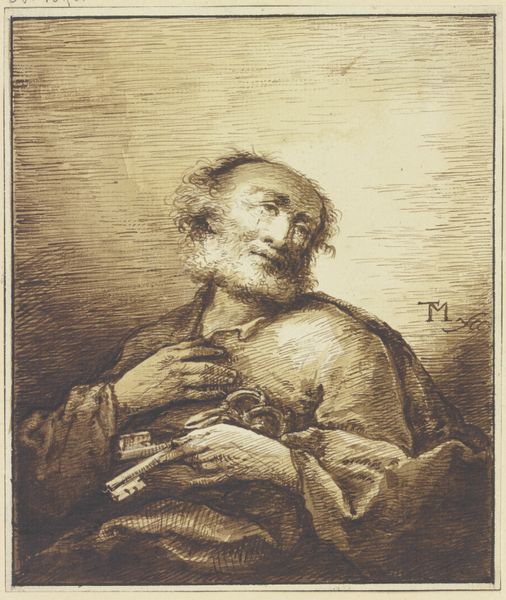 Curator: Here we have a compelling portrait, attributed to Johann Georg Trautmann, identified as "Paul the Apostle". It resides in the Städel Museum. Editor: My first impression? Melancholy. The figure’s downward gaze and the subtle shading give off a sense of introspection, maybe even weariness. And, well, that's quite a hefty sword he’s clutching. Curator: Exactly. Trautmann was clearly focused on the interplay of light and shadow. The piece employs etching, engraving, with potential use of chalk, graphite and ink... You see how the cross-hatching defines the folds of his garments? And those deeply etched lines really convey the weight of his years, don’t they? Editor: Absolutely. The process becomes integral to the emotion. The density of lines seems almost woven, emphasizing texture—the coarseness of the fabric, the roughness of his beard. How fascinating to think about the labour invested. It’s all about that etched line, each one placed deliberately to build up this image. Curator: Yes, you feel that materiality. It whispers of baroque drama, but there’s also something raw, almost brutally honest in the depiction. Think of Paul’s life – a relentless journey of conversion, preaching, and persecution. Trautmann’s captured some essential grit of it. Editor: That sword becomes all the more poignant, then. Less a symbol of triumph, more a constant companion, forged and wielded within tumultuous conditions of existence. What price belief? I’m intrigued, though, about Trautmann's choices regarding material – does this selection point towards a specific kind of audience or patronage at that time? Was the relative accessibility of printmaking intentionally utilized to circulate these notions? Curator: Those are very insightful questions. Perhaps the print medium, allowing for wider dissemination, was meant to serve that evangelical mission? Or simply an artistic choice of materiality and methods? The image certainly demands contemplation. Editor: Indeed, contemplating the choices—medium, line, shadow—lends further gravity to our experience, underscoring his tangible world and the tools that served him. Curator: It leaves us with this poignant representation where the intensity and craftsmanship merge into quiet power.