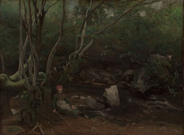 Curator: The oil painting before us, dating back to 1828, is entitled "At Civita Castellana, Wooded Rocks," by Camille Corot. What is your first impression? Editor: Gloomy. Yet, something about the compositional structure of light and shadow compels me. There is a sense of sublime tranquility battling with primordial dread. Curator: The artist's formal technique employs layers of nuanced umber and ochre pigments in such a way as to describe the landscape with very few colors and simple tonal contrasts, isn't it fascinating? The texture itself, visible evidence of Corot's brushstrokes, gives life to the seemingly static scene. Editor: Indeed, notice the symbolic resonance of trees – emblems of life, growth, but also vulnerability. See how they are set against a backdrop of rocky crags evoking ancient power and enduring resilience. There's a clear tension here. It taps into universal myths of humanity's place within the vastness of nature. Curator: Agreed. And it seems important to consider Corot's painting was done en plein air. The visible brushwork suggests spontaneity and observation. We see it today, understanding the complex layering; Corot uses subtle contrasts between warm and cool tones. The placement of rock creates asymmetrical balance, drawing our eye upwards. Editor: As for Civita Castellana itself, that area holds such deep cultural meaning, it having been layered with Etruscan, Roman and Medieval settlements. It has historically represented human impact on nature and nature's dominance over man, both reflected and woven into the narrative we view here. The very setting enriches its emotional depths and complex narrative implications. Curator: You bring a relevant viewpoint in noting those implications within "Wooded Rocks". Seeing Corot engage formal relationships is a means to expose layers, and I concede to the rich potential in your suggestion of interwoven symbolisms that connect the past to this visual present. Editor: Thank you, Corot gives much to interpret, both empirically and in a wider sense that makes us consider our cultural roots and ecological vulnerability.