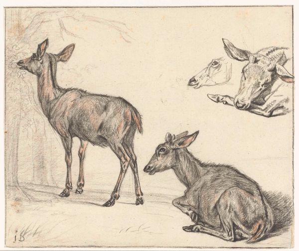 Piet Meiners made this delicate drawing, Studies van een hert, using graphite on paper. Living in the Netherlands, Meiners was part of a generation grappling with questions of national identity, especially as industrialization began to encroach upon rural landscapes. His choice to depict deer, animals often associated with the wilderness, subtly reflects a longing for an untouched, idealized version of the Dutch countryside. Consider how Meiners uses simple lines to capture not just the physical form of the deer, but also a sense of their quiet presence and vulnerability. These studies weren't just about observing animals; they reflected broader cultural anxieties about the changing relationship between humanity and nature. Meiners invites us to contemplate our place within the natural world and the emotional connections we form with it.