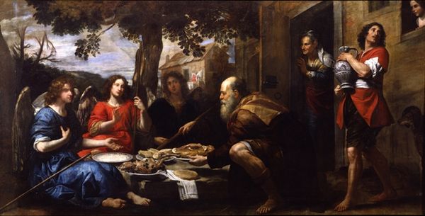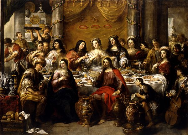 Curator: We're looking at Peter Paul Rubens' "The Last Supper" painted sometime between 1654 and 1655, rendered in oil paint. It's a compelling scene, wouldn’t you agree? Editor: My first impression is one of lavishness, but also discomfort. There's a density to the scene, a crowding…and what about this prominent water jug on the left, stealing space from the sacred figures? Curator: The drama, theatrics, and intense emotion displayed are quite typical of Baroque art from the time. Think of the Counter-Reformation influence, visually reinforcing the importance of the Eucharist. Editor: Sure, but beyond that, what was involved in the material process? Rubens’ workshop certainly played a role here. Oil paint allows for layering and richness, but how much was Rubens hands-on versus assistants prepping canvases and grinding pigments? What sources provided these expensive, rich pigments? Curator: It’s fascinating to consider how artistic production mirrors societal structures. Here, Rubens likely had workshop assistants fulfilling roles much like an early assembly line to complete this piece, playing to his public as the great master, and in turn solidifying his place as an essential figure in religious painting of the time. Editor: The red drapery dominates the top of the canvas. Who wove those textiles, dyed them? Were they purchased, bartered for, or gifts? Each color and piece represents value and the means of acquisition and representation for a culture eager for excess, especially religious iconography. Curator: Indeed, the symbolism is crucial. This is an idealized and carefully curated moment, aiming to elicit an emotional response from the viewer, drawing them into the heart of the narrative as much as possible. Editor: It does highlight how art becomes a product, a symbol of status as much as an expression of devotion. Looking beyond Jesus himself to see the making of such complex painting allows a window into a wider society and the economics that shaped cultural aesthetics and values. Curator: Seeing Rubens’ vision through that lens is definitely enlightening and something our visitors can consider. Editor: A painting is much more than brushstrokes on a canvas, really. Thanks for providing a wider frame on this magnificent, intense, Baroque painting.