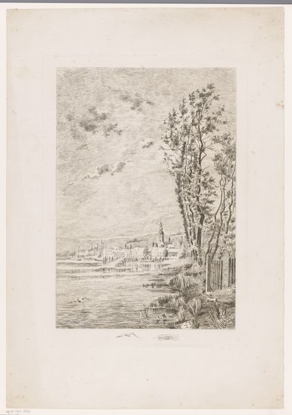 Justin Gabriel created this etching of a village landscape with a lake view in the late 19th or early 20th century. The composition is dominated by a tranquil, greyish palette, punctuated by the textured, dark foliage on the left which contrasts with the light, airy sky and water. This contrast creates a visual tension that draws the eye across the scene. The artist's use of etching lends a unique texture to the work, where the fine, closely spaced lines create a sense of depth and atmosphere. Gabriel uses this etching technique to explore the interplay between light and shadow. The dark strokes, particularly in the depiction of the trees and the fisherman's boat, function as signs, inviting the viewer to explore a calm, intimate encounter with nature. The structural organization of the artwork, with its carefully balanced elements, embodies a serene experience. This etching invites us to reflect on the complex relationship between nature, representation, and the human experience.