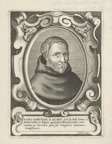 Curator: This engraving, likely created between 1710 and 1738, is titled "Portret van Angel Cristofori del Toscano, 34ste Minister Generaal van de franciscaner orde." It depicts a figure from the Franciscan order. What strikes you immediately? Editor: The composition feels inherently hierarchical. The oval portrait dominates, surrounded by text almost like a support structure. The gaze directed upwards, coupled with those prayerful hands, certainly positions him within a specific spiritual context. Curator: Precisely. The formal structure reinforces his elevated status. Note how the artist utilizes line work; crisp, controlled lines define the figure and his garb, while a more textural approach is applied to his face, indicating age and perhaps wisdom. The use of chiaroscuro adds depth. Editor: But that elevation comes at a cost. He is presented within this rigid framework, quite literally confined by text that seems to define him—his name, titles, achievements. This feels indicative of how institutions can both celebrate and restrict individuals, particularly religious ones, within very particular ideologies. Curator: An astute point. And what about the details, like the coat of arms below the oval? These visual markers were meticulously crafted to solidify the man’s significance. This attention to detail echoes Baroque aesthetics, which emphasizes grandeur and authority. Editor: True, but let's consider that such emphasis often came with a deliberate exclusion of those outside such structures. Was Toscano a force for unity or did he embody power dynamics that entrenched further marginalization and suppression, during a time when the Church was actively persecuting folks, particularly heretics and suspected witches? What kind of influence did this individual wield, and on whose backs was that power built? Curator: From a formal standpoint, one cannot deny the effectiveness of this piece. It is undoubtedly well-executed, and serves its purpose effectively as a declaration of authority. Editor: Yet it's important not to ignore the broader picture, to delve into the subject’s impact beyond artistic appreciation and assess how his life impacted those outside his carefully constructed narrative. Art is powerful but also situated; considering whose voices it amplifies, and perhaps suppresses, adds necessary depth to how we encounter such pieces. Curator: A vital perspective, highlighting the responsibility art bears towards shaping wider socio-cultural narratives, indeed! Thank you for sharing these contextual layers. Editor: My pleasure; such layers can only amplify how an artwork’s meaning resonates today, and perhaps challenge conventional appreciations.