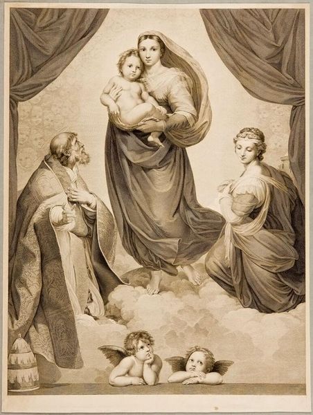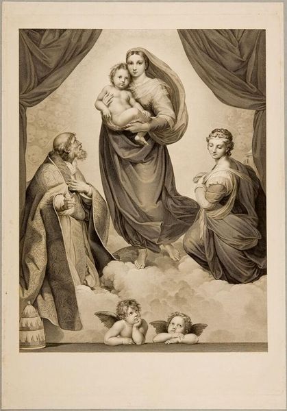 Curator: This is Hyacinthe Louis Victor J.-B. Aubry-Lecomte's "Sistine Madonna," a print held in the Harvard Art Museums collection. Editor: It feels weighty, despite the soft clouds and cherubic figures. All the fabrics depicted are heavy, creating a certain sense of formality and drama. Curator: The image is replete with religious symbolism, drawing on centuries of tradition. Consider the gaze of the figures and the placement of the angels. It speaks to power dynamics and hierarchies reinforced in religious narratives. Editor: Yes, the positioning is crucial. The Madonna's central placement signifies her supreme importance, while the surrounding figures support and validate her role. The curtains above imply a theatrical unveiling, heightening the sense of drama. It’s all very deliberate. Curator: Indeed. The cultural memory embedded in these symbols is powerful. How have these visual cues shaped our understanding of power, gender, and faith across generations? Editor: It's a dialogue worth continuing. This piece prompts us to question the narratives we inherit and how these images persist in our collective consciousness.