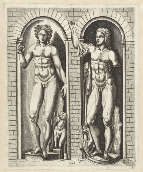 Curator: Just look at this delicate dance of line and shadow! It's "Water en Lucht" – Water and Air – a Mannerist engraving dating back to 1558, currently residing here at the Rijksmuseum. Balthazar van den Bos is credited as the artist, isn’t it wonderful? Editor: My first thought is that it evokes a very cool, almost somber mood. The stark contrast and classical nudes set in such rigid architectural settings feel simultaneously powerful and vulnerable. What's your take? Curator: I'm utterly captivated by how Balthazar uses classical allusions. Note the figures themselves, allegorical representations, certainly. She, with the dolphin, symbolizing water. He, clasping an eagle, mastering the skies. It feels like an attempt to tame or understand the primal forces. Editor: Yes, and the choice of the dolphin and eagle is not arbitrary. Dolphins have been linked to transformation and intuition for centuries. And the eagle – a solar symbol of power, royalty, even spiritual ascent, you know. The Renaissance fascination with nature’s hierarchies… Curator: Precisely! I see it reflecting humanity's enduring fascination with binaries – earth and sky, male and female, rational and intuitive. It’s those charged, almost theatrical poses, heightened by that meticulous engraving style, creating tension. What does the engraving imply to you about power at the time? Editor: Well, for me, this type of piece aimed to consolidate classical traditions into a Christian European vision; so its cultural memory has undergone countless translations! Also, this print carries that early modern awareness that perception affects reality: just consider how many of these artworks depicted people, gods, figures looking directly into the face of the beholder. Curator: I never thought about it like that. I only noticed how beautifully crafted and elegant it is. You are right though, looking closely, there is so much here. A moment of transformation held in ink! Editor: Absolutely. Thanks to its strong imagery and masterful rendition, it retains the power to move, puzzle and inspire awe in the observer centuries after it was made.