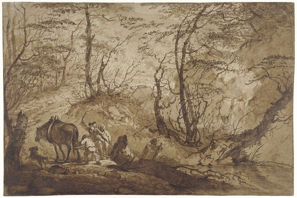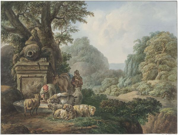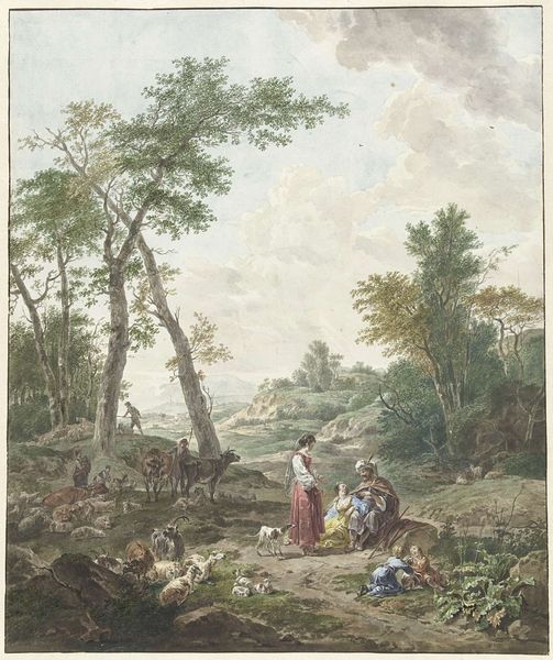 Curator: Here we have Hendrik Abraham Klinkhamer’s "Herder, herderin en vee rustend voor een vervallen stal," dating from sometime between 1820 and 1872. It's currently held in the collection of the Rijksmuseum. Editor: Oh, wow, that light. It's gentle, sleepy almost, like a hazy afternoon dream. There's a real quiet to it, even with all the…well, the animals! It feels like a stolen moment, if that makes sense. Curator: Indeed. Notice how Klinkhamer organizes the composition, using the dilapidated barn and the central tree as vertical anchors. The scene is subtly structured by implied diagonals, drawing our eye from the resting livestock to the distant figures on horseback. There's an engagement here with the sublime. Editor: Sublime...yes, that sounds fancy, but I think I see it! It’s not just a cute farm scene. There’s that contrast between the simple life—the herder, the animals—and this little suggestion of something grander, a wilder landscape lurking in the background. It's comforting, in a melancholy way, but still a little wild at the edges, just like my grandma. Curator: Note, too, the artist's application of watercolour and pastel. See how he achieves a certain luminosity by layering thin washes and juxtaposing them with strokes of deeper pigment? Klinkhamer skillfully balances the romantic ideal of rural life with realistic depiction. Editor: That softness does things to you, doesn't it? Like he caught the exact feeling of late afternoon, when the light turns butterscotch, and you just want to curl up with a good book. You feel that heat rising from those lying cows. Makes me miss summer. It isn't photographically exact realism... thank heavens. It invites reflection instead. It suggests as much as it states outright. Curator: Precisely. He doesn't belabour us with exacting detail. Editor: I feel I know those animals, even the cows and I’m generally disinterested in cows, normally. So, looking closely I notice, it is genre painting with a dash of realism, with this amazing almost luminous pastel. Very fetching. Curator: Quite. It synthesizes diverse formal approaches while conjuring something uniquely intimate. Editor: So, Hendrik took this gentle setting and transformed it into something really poignant. Curator: Transcendent even, I would offer. Editor: Yes, alright, well said.