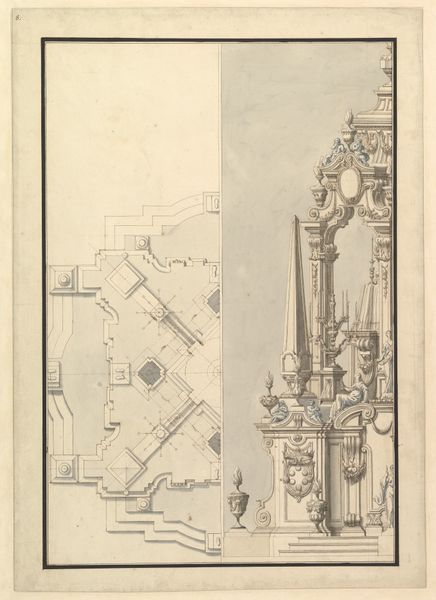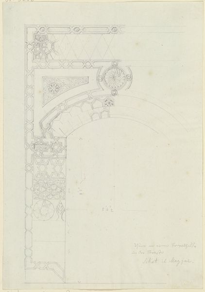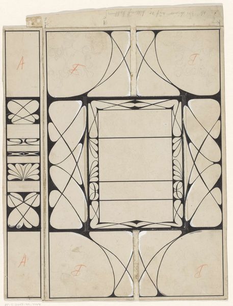 Curator: At first glance, it's a rather restrained piece; mostly straight lines, some soft curves, and minimal shading to give dimension. Editor: This is "Two designs for a ceiling", dating from 1850 to 1900. It is believed to be by Jules-Edmond-Charles Lachaise. The medium is listed as both drawing and print. It's currently held in the collection of the Metropolitan Museum of Art. The designs represent what look to be classical geometric patterns. Curator: What I find particularly compelling about these types of architectural renderings is the subtle demonstration of power. Consider the grand halls and residences these designs were meant to adorn—who commissioned them, and who would have lived and moved within them? The patterns, even in their formality, exude authority and affluence. Editor: Exactly, we have to situate this design within its socio-political context. The symmetry and precise detailing speak to a specific kind of architectural aspiration prevalent at the time, linked closely with class and cultural identity. Who was commissioning such elaborate ceilings? Likely members of the elite who wished to visually assert their place in the hierarchy. Curator: The artist is essentially participating in the construction of that visual language of power. I also see how the labor is carefully hidden from the image. These perfectly realized shapes deny the physical exertion required to install something like this at great heights. Editor: That’s right. If installed, the ceiling would have transformed the architectural experience of anyone moving through that space, literally looking up to it and, in a way, internalizing its message. But is there also, perhaps, a dialogue here between form and function? After all, these are not merely patterns, but components of a larger structural element of the building. Curator: It’s tempting to see this purely through a Foucauldian lens of power dynamics, yet there's also an element of artistic ingenuity at play. The way the patterns interact, the use of repetitive motifs...Lachaise displays a refined artistic sensibility within the conventions of decorative art. Editor: Indeed, thinking about it now, this seemingly straightforward design speaks volumes about the intersections of class, aesthetics, and the subtle but effective wielding of influence in the 19th century. Curator: A confluence certainly worthy of a second look.