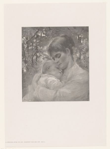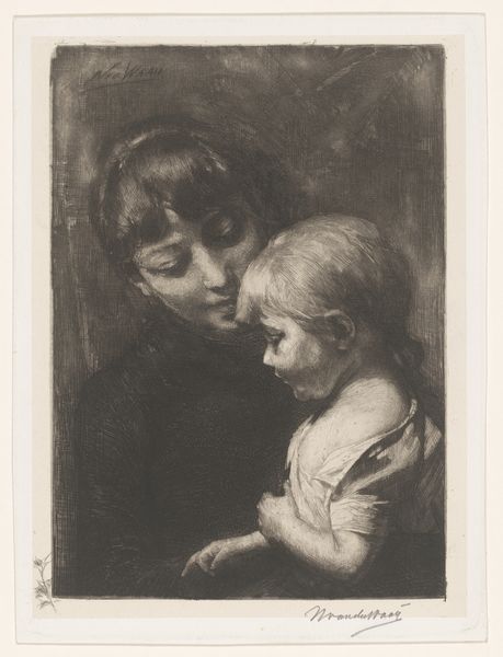 Curator: Oh, it's tenderness embodied. The texture alone feels soothing. Editor: That’s a wonderful way to put it. This is "Avond," or "Evening," by Hendrik Johannes Haverman, created in 1896. It’s a pencil drawing, now residing here at the Rijksmuseum. The work is also noted for its influence by Intimism, a movement reflecting domesticity and quiet moments. What do you feel draws you into the scene so immediately? Curator: Absolutely the embrace. It radiates warmth. See how the mother's gaze is so focused, protective. The soft gradations in the pencil work evoke a palpable sense of comfort. Editor: Yes, it captures the quiet, hallowed domestic space that was gaining attention amongst the middle class. This intimate portrayal moves away from public, historical themes dominant in earlier art academies and caters to intimate and sensitive subjects. The lines around the hair and dress are sharp yet not constricting, but it gives definition without losing the serenity. Haverman was, in some ways, contributing to the emerging cultural value placed on private life and familial bonds. Curator: Exactly. It whispers secrets about the power of intimate, ordinary moments, of simply being. There is a quiet rebellion in it that still moves me. The symbolism is not overt, it's almost…inherent, built into the gestures. The protective hug seems a primal act of the evening— guarding someone so young into dreamland. Editor: Precisely, and how daring to elevate it in the artistic cannon! To turn from battles to bedtimes. It really marks a turn, even at the cusp of the twentieth century. It asks the question "Is this quiet affection not art worthy"? Curator: To capture something so inherently quiet with such precision and nuance. Art exists within a culture to elevate certain perspectives to center stage. Perhaps this moment could be staged—the models—but that feeling you get when the work reveals the inner soul and tenderness within a scene? A true gem of an era defining beauty as more than pageantry. Editor: Indeed. Haverman invites us to consider beauty, love, and affection not as symbols, but inherent within lived experiences and spaces. It has really been a moment to examine these complex layers with you. Curator: Likewise, thank you! This tender image will follow me tonight and probably beyond.