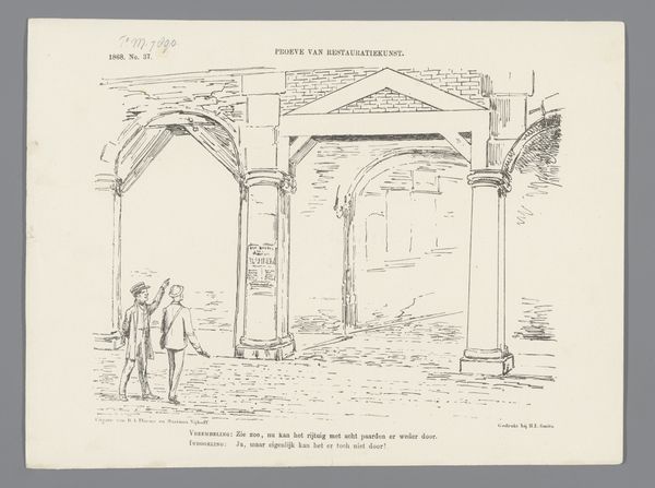 Editor: Here we have "Spotprent met het grafsteen van het ministerie Heemskerk-Van Zuylen, 1868" made in 1867, by Johan Michael Schmidt Crans. It's an ink drawing on paper, resembling a caricature. The overall mood seems satirical, with the tombstone and wilting tree suggesting decay. What do you see in this piece? Curator: The wilting tree is a crucial visual element, as you noticed. Given that this is a caricature of a political administration, consider how natural imagery functions within political discourse. The dying tree could represent the fading power and influence of the Heemskerk-Van Zuylen ministry. Why do you think the artist chose to depict them as a tombstone specifically? What implications does that carry, especially concerning their legacy? Editor: Well, a tombstone signifies the end of something. Maybe the artist wanted to show that their policies or their time in power were essentially dead and buried? The inscription seems important, too. Curator: Absolutely! Let's unpack the inscription. It satirizes their promises of peace, juxtaposing "Vrede" [Peace] with a sense of eternal, perhaps forced, rest ("Hun asche ruste met Vrede..."). How might the concept of forced peace tie into broader societal tensions or political power dynamics of the time? What commentary might the artist be making about the actual state of "peace" under this ministry? Editor: I guess it implies that the peace they achieved wasn't genuine or beneficial for everyone. It was imposed rather than truly earned. Curator: Precisely! And who benefits from such impositions of power and “peace?” This work compels us to question the narratives propagated by those in authority and consider whose voices were suppressed in the process. Considering this perspective, does this impact your reading of the rest of the visual components? Editor: Yes, it makes the image more potent. I understand that the drawing is less about history and more about questioning political messaging! Curator: I completely agree; situating this artwork within its historical context reveals its powerful commentary on governance, peace, and societal narratives.