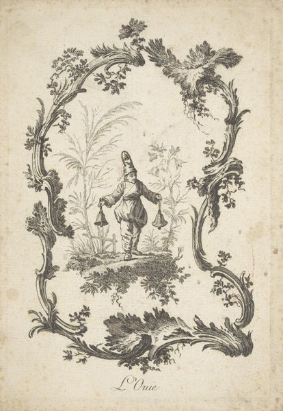 Curator: This delightful engraving is called “Reuk,” which translates to “Smell” or “Scent,” created between 1758 and 1774, now residing here at the Rijksmuseum. Editor: The wispy Rococo style and muted tones give it a dreamy, almost melancholic feel, even with the whimsical subject matter. It reminds me of pressed flowers, delicate and faded. Curator: It's fascinating how Robert Cooper captured a fleeting sense—smell—in a static visual medium. Consider the symbolic weight he's placing on sensory experience during the Enlightenment. Editor: Absolutely. And that symbolic weight becomes literal, doesn't it? Look at the young man carrying the weight of that floral cornucopia— he's practically bowed under the burden, perhaps signifying the potentially overwhelming nature of sensory input or even the societal expectations around luxury and fragrance. Curator: Intriguing. The ornate frame further isolates the experience of "odorat", visually cordoning off this sensory world. It is one of a set, portraying the five senses. It suggests a privileged and controlled environment, doesn't it? One where these refined sensations are to be savored, not overwhelmed. Editor: The class implications are so obvious, you're right. Fragrance as a leisure pursuit. And who has time to be idle, lost in beautiful fragrance? The rococo style almost weaponizes those visual cues of high society— the flitting line work is almost comical, it gives a cartoon like effect in the subject's shape and attitude. Curator: Cooper uses landscape and genre painting conventions within that decorative frame. Note the casual posture of the figure—how unlike that feels with the grandiosity that also frames his depiction. The symbolic interplay heightens the importance of both. What a peculiar choice, indeed! Editor: It brings a different sense, in retrospect, I find that "Reuk" reflects an awareness of how scent could construct class and privilege at this point in history, how this sense could shape the perception of a good taste at court. Curator: Exactly! A sensory marker. And for our listeners, perhaps it marks a historical point from which to re-evaluate sensory engagement in today’s world. Editor: It is quite a treat for eyes to see this at Rijksmuseum. "Reuk" leaves us with much to ponder.