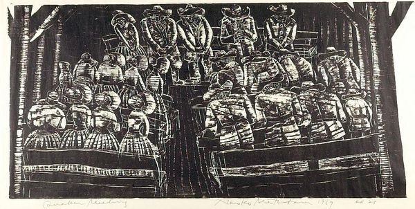 Editor: Here we have Ángel Bracho’s print, "Salute to the Sun". It's an engraving, depicting a family group with striking detail, almost dreamlike. What catches your eye, and how do you interpret this work? Curator: Bracho was a politically engaged artist, interested in depicting indigenous cultures of the Americas. This piece strikes me as a negotiation of power: the seated figures in indigenous dress seem central. How might their ritual, whatever it is, intersect with the Christian cross visible in the background? What is the artist trying to say about the encounter between cultures? Editor: That’s an interesting point about cultural encounter. I was so focused on the sun as the central element, representing life and energy, but the cross introduces a different narrative. Do you think it’s a narrative of conflict, or something else? Curator: Perhaps "conflict" is too strong. More like "coexistence under duress," if that makes sense? Look at how the sun, a pre-Columbian symbol, is literally being saluted. Meanwhile, the looming presence of the Church cannot be ignored; these rituals would’ve been forced underground or syncretized during colonization. The artist seems to acknowledge both traditions existing simultaneously. Editor: So, it’s not simply a beautiful scene, but a comment on cultural survival and adaptation. I wouldn't have seen that on my own. Curator: Precisely. The piece highlights not only the beauty, but also the complex power dynamics at play, as Bracho prompts viewers to reflect on indigenous cultures shaped by socio-political forces, especially within the gaze of powerful institutions. Editor: This gives me so much more to think about regarding art and its role in portraying cultural histories. Thank you! Curator: My pleasure. The most compelling art invites ongoing investigation.