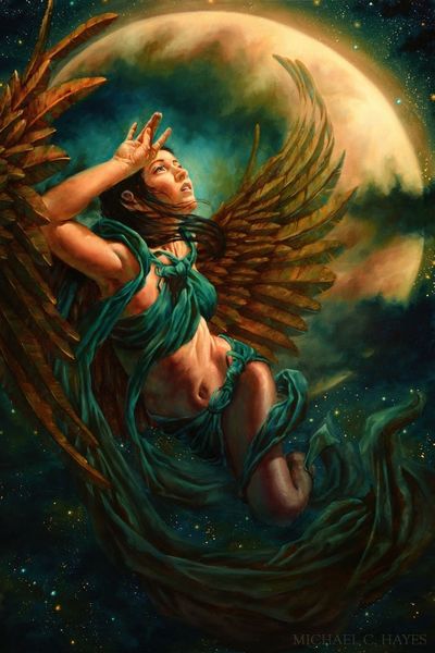 Editor: Here we have an oil painting entitled *Amaranthine* by Michael C. Hayes. The first thing that strikes me is the figure’s downcast gaze and posture; she appears burdened somehow. How do you interpret this work? Curator: Immediately, I notice the prominent, almost brooding wings, which speak to a complex and multifaceted symbolism. Wings, across cultures, denote aspiration, freedom, and even divinity. Yet here, they seem to weigh down the figure, restricting movement rather than enabling it. What might that suggest about the traditional symbols of freedom? Editor: Perhaps that freedom can also be a burden, or that aspiration can lead to disappointment? The word "amaranthine" makes me think of something eternal, or unfading... does that connect with the imagery here? Curator: Indeed! The tension between the figure's apparent despondency and the title's suggestion of eternity offers a powerful contrast. Amaranth, mythologically, represents immortality, suggesting that perhaps the emotional weight this figure carries is not temporary. Is this a commentary on the persistence of memory, or perhaps even inherited trauma, echoing through generations? Editor: So, the artist might be using the wings, not as a symbol of individual freedom, but more to reflect a connection to a longer, more complex past? Curator: Precisely. The surrounding foliage, reminiscent of classical depictions of Arcadia, adds another layer. This Eden-like setting contrasts with the figure's obvious emotional distress, suggesting that paradise itself can be a place of sorrow. How might this invert traditional visual metaphors? Editor: It really changes how I initially perceived it, I was only looking at it as fantasy illustration at first glance, but seeing it in this deeper cultural context opens up completely different angles of meaning. Thanks for the insight. Curator: It's a powerful reminder that symbols carry weight through time. And by grappling with this inherited iconography, Hayes compels us to confront the stories embedded within the visual language around us.