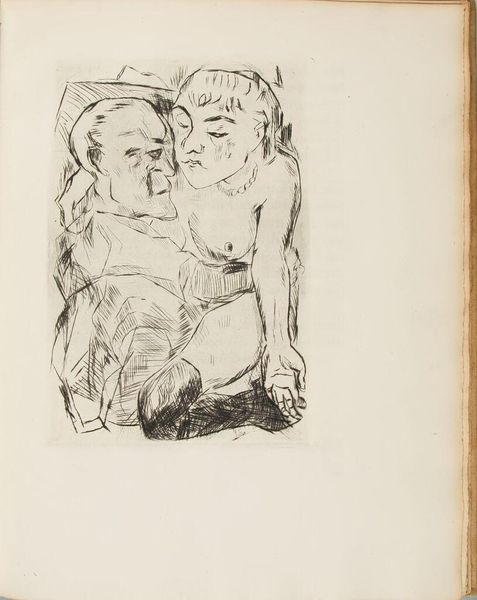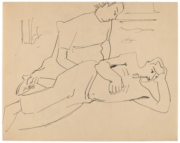 Curator: Lovis Corinth created this ink drawing, titled "Prophecy," in 1914. Corinth’s place in art history is interesting, specifically as a bridge figure who transitioned from Impressionism towards the expressionist movement. Editor: I'm immediately struck by the starkness of the image and the seemingly vulnerable position of the central figure. There’s something very unsettling about the composition – the gaze and angle feel intentionally unsettling. Curator: You've picked up on the Expressionist elements. The frenzied lines definitely enhance the drama, wouldn’t you agree? If we situate it in its historical moment—on the cusp of the First World War—we start to unpack some of that anxiety. Editor: Absolutely, the historical context is key. I think looking at the power dynamics within the composition is crucial too. This feels overtly staged in ways that raise some pretty challenging questions about viewership, control, and maybe even complicity. Who is the woman in the background? And how does that impact what we think is going on here? Curator: Many read the reclining nude as prophetic, suggesting a foretelling of pain and suffering that mirrors what Germany—and Europe—were about to experience. It fits, particularly when understanding the overall fatalistic tone of pre-war Expressionism. Editor: The figures’ apparent emotional state just magnifies that effect. This work resonates even today—the raw emotional charge speaks directly to us, doesn't it? It feels almost impossible not to connect its themes with present day gender politics, race relations, and abuses of power we're still grappling with in our society. Curator: I see this more as an indication of Corinth trying to create work that speaks to more universal themes. It is through these raw expressive styles that Corinth can leave his legacy in art history. Editor: Perhaps...it certainly demands conversation and critical examination which, I feel, is so vital to what we do here. Curator: I agree; the conversations it provokes only enhance its artistic and cultural worth.